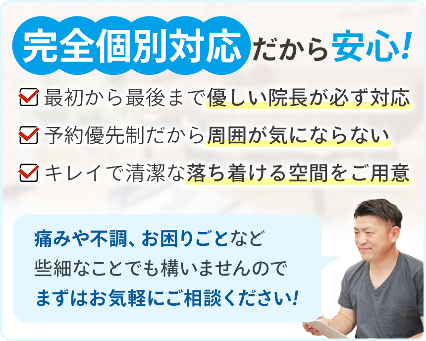 事前予約をすることで、時間を無駄にすることなく、すぐに施術を受けていただけます。